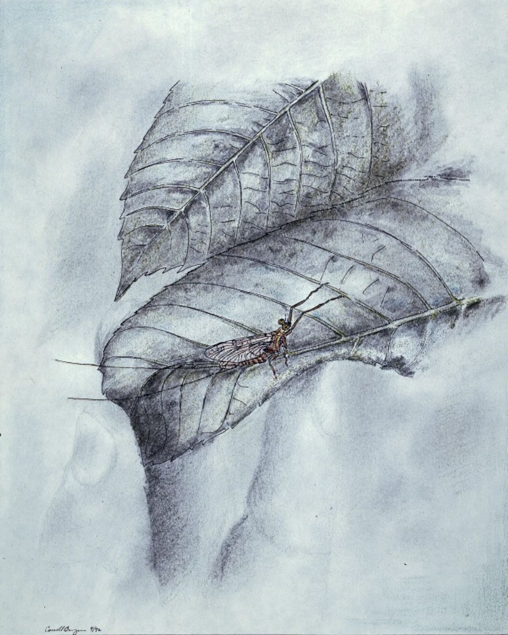"I came across this specimen while wading amidst granite boulders in a 2nd order Piedmont stream west of Philadelphia. I photographed the tiny beast with a macro lens and caught my fingers bending the tip of the leaf (Lower left). I love turning over rocks to see what's there. I hope these paintings will cause people to love them themselves with the result that they take care of our